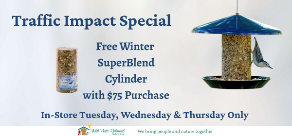 We owe our success to YOU, our loyal customers, for standing by us despite the construction chaos. We appreciate that you continue to deal with the inconvenience to come to us for your bird feeding supplies. We will continue to show our appreciation for your loyalty and support by offering free items with purchase on Tuesdays, Wednesdays, and Thursdays, as well as bird-friendly coffee and Mary Ann Donut Kitchen goodies on Mondays and Fridays during the construction.