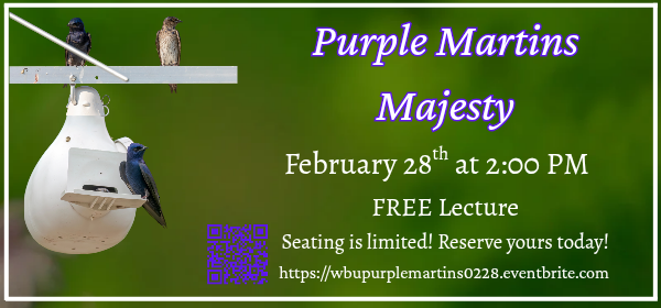 Whether you are a seasoned "Martin Landlord" or simply curious about these high-speed flyers, this session will provide the insights you need to appreciate (and attract!) these birds to our region.